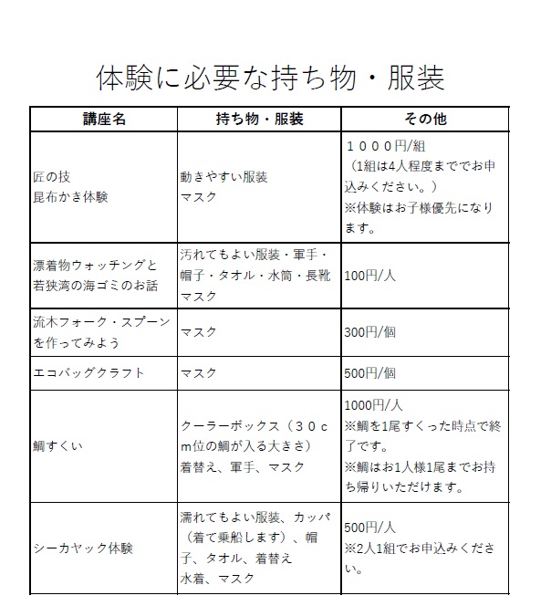 企画イベント持ち物・服装