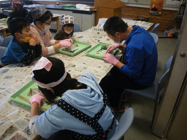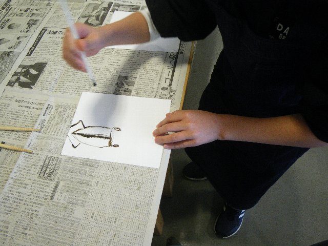 はじめに海浜自然センターの職員がイカの生態についての講義をした後、スライドを使って解説をしながらイカの解剖を行いました。解剖の途中で、イカの墨袋を取り出し、割り箸の先で画用紙に思い思いの絵を描きました。