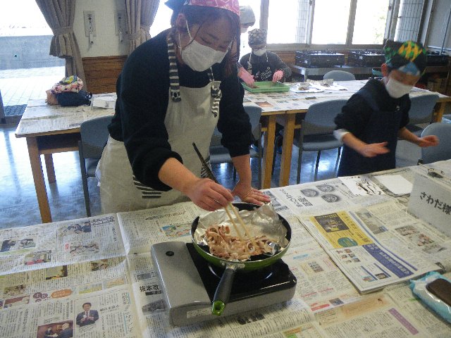 解剖が終わった後、イカの身や足を使った調理体験、試食を行いました。「イカの塩コショウ炒め」、「イカのホイル焼き」、「イカわたのホイル焼き」の3つのメニューから選びました。体験学習室内にいい匂いが立ち込め、参加者たちは舌鼓を打っていました。