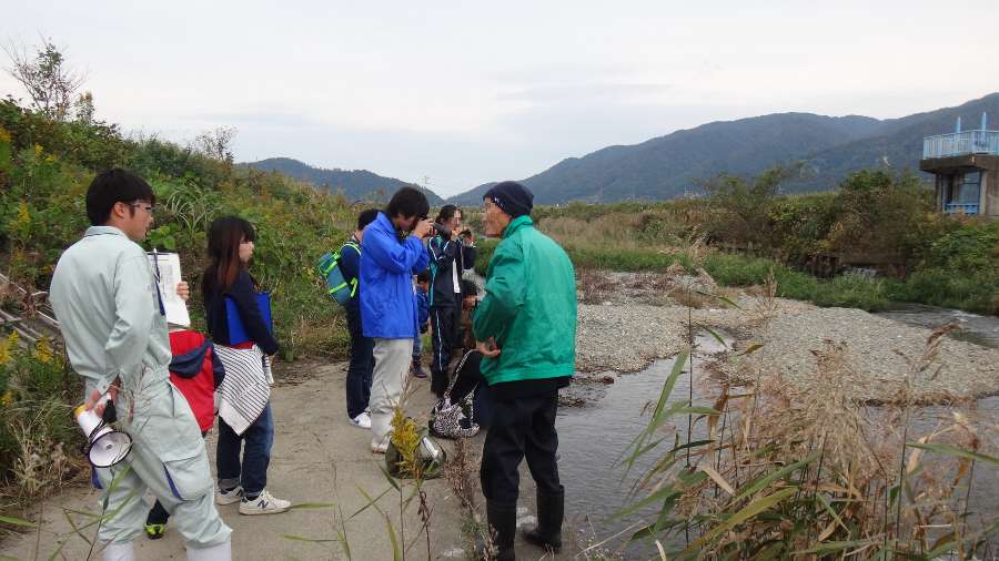 若狭町にある三方青年の家で、サケの話、観察場所などの説明をした後、 三方湖に注ぐ鰣(ハス)川の佐古橋まで車で移動し、下流に移動しながらサケの姿を観察しました。