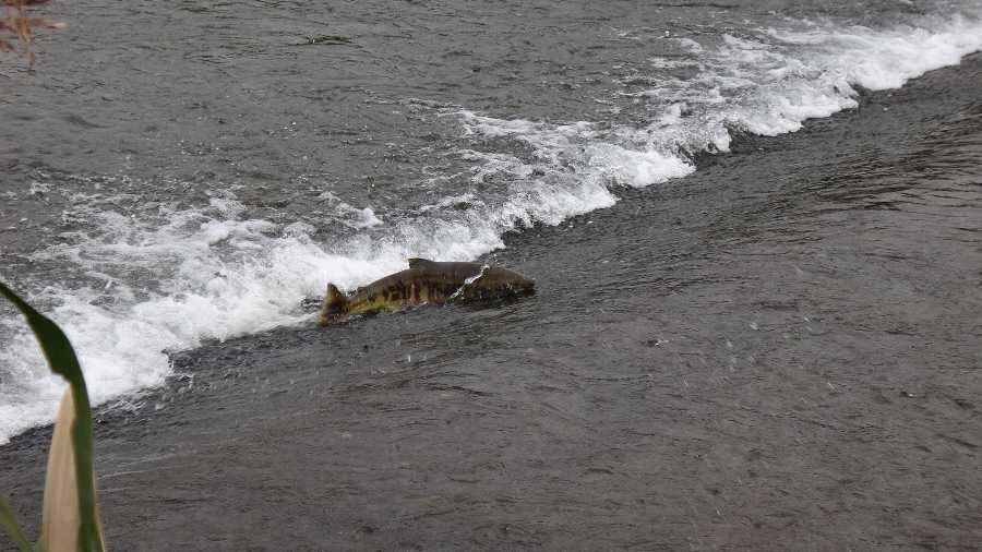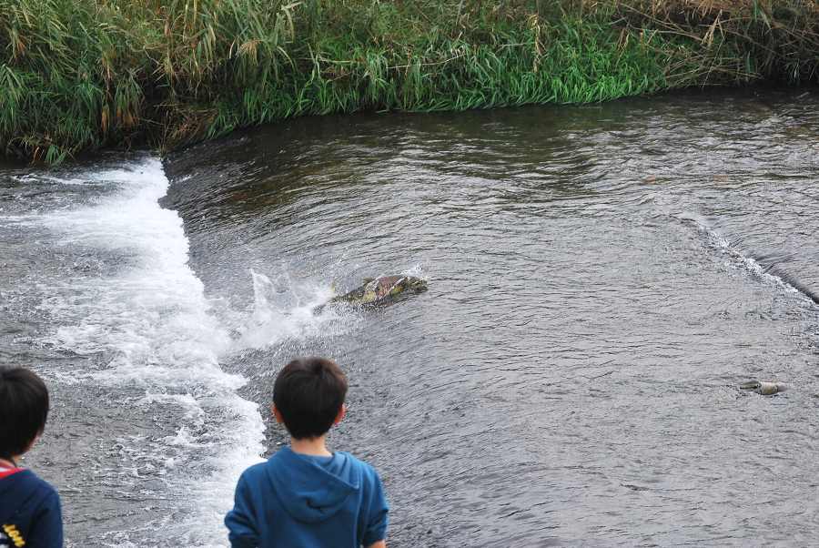 上古橋付近の堰では、サケが堰を上る姿を観察でき、参加者のみなさんが「頑張れー」と温かい声援を送っていました。