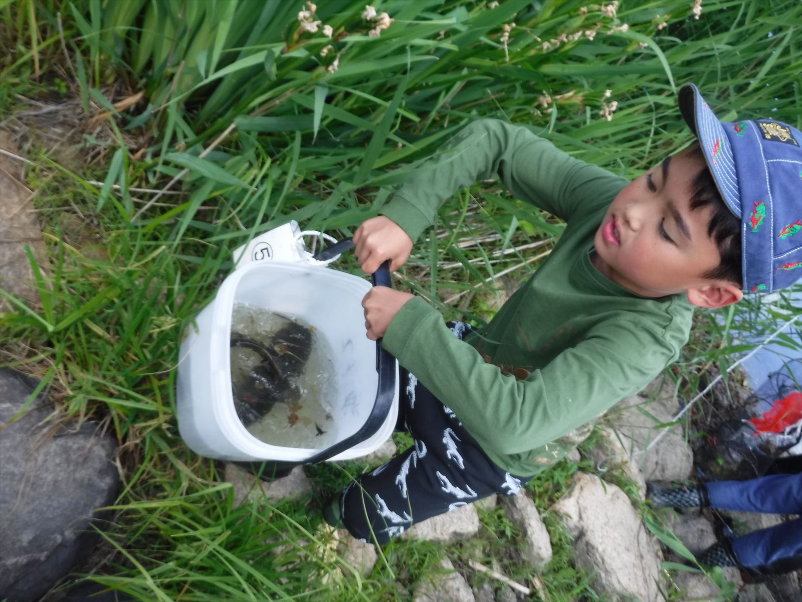 かご網には、外来生物のウシガエル・ミシシッピアカミミガメ、在来生物のナマズ・テナガエビが入っていました。