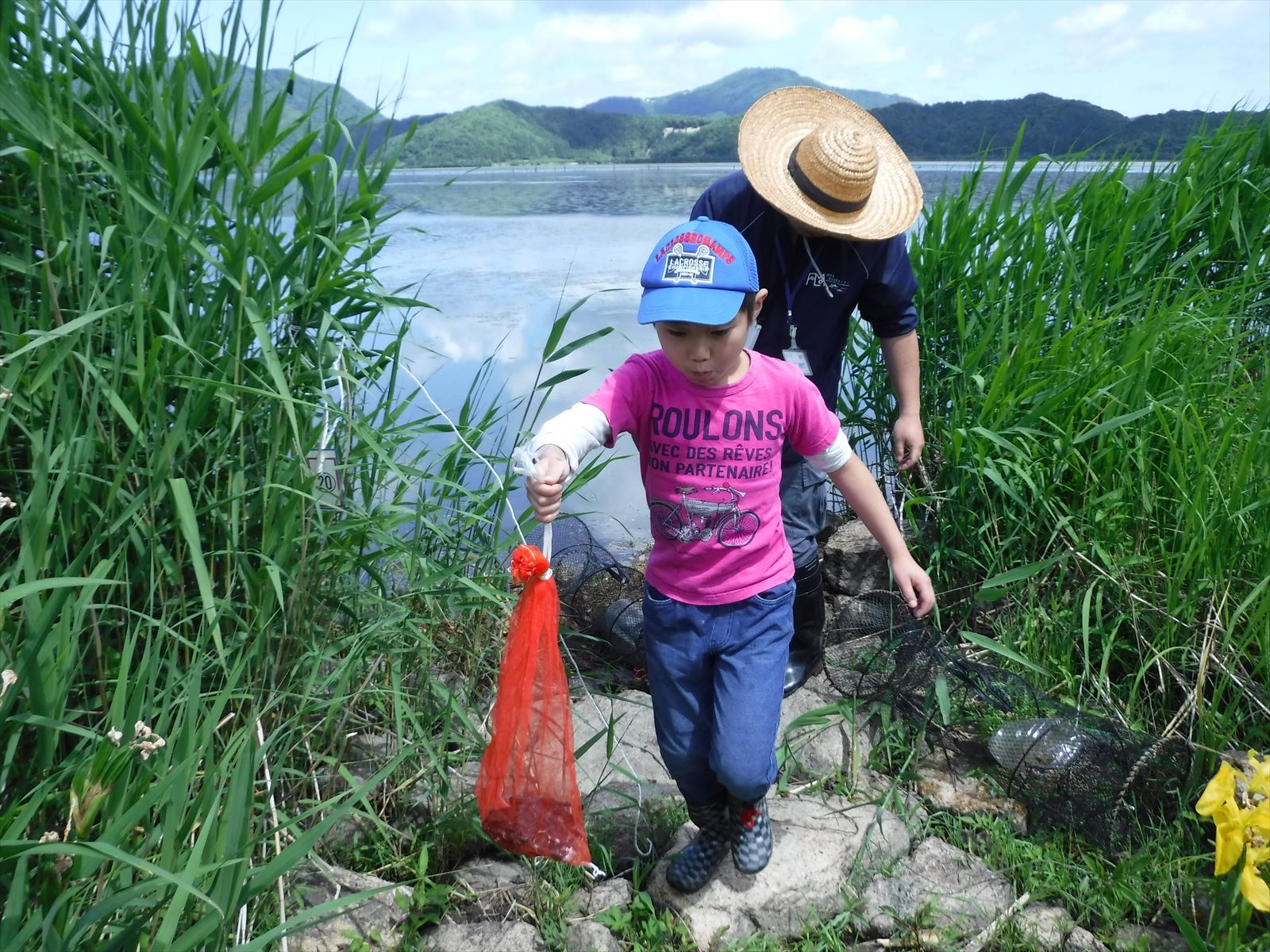 センター職員から、外来生物を捕まえる時の注意事項を聞いた後は・・・三方湖畔へ移動。駆除をするかご網を引き上げます。何が入っているかな?
