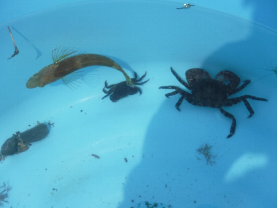 ホンヤドカリ、イソガニ、ヒライソガニ、アナハゼ、キヌバリ、スジエビ、イソスジエビ、テナガエビが採集できました。
