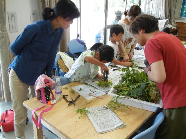 講師として博士(理学)の早坂英介氏に来ていただき、午前は講師の方から標本を作るための植物採集のポイントを説明していただき、採集スタート。どんな植物でも良いのではなく、名前を判断できるように花や実をつけた植物を探し、できるだけ根も入れて採集するのは大変でしたが、どの家族も20~30種類の植物を集めることができました。