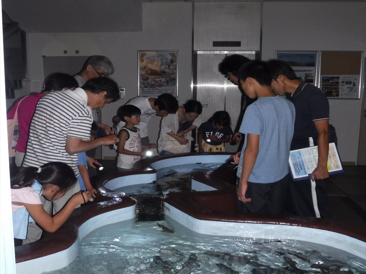 夜の生き物探検ツアーでは、暗い水槽の中をゆうゆうと泳ぐアナゴや砂に潜って眠るベラを観察したり、お昼とは違った魚達の様子を観察しました。