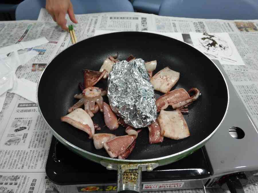お母さんたちは、「イカの塩コショウ炒め」と「イカのホイル焼き」を一つのフライパンで同時に調理するなど、主婦力を発揮しておられました!