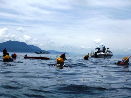 25日は安全管理講習として、東京海洋大学教授の千足先生に講義と実習をしていただきました。重大事故事例やヒヤリハット事例をいくつか紹介していただき、どういう点が問題であったか、どうすれば防ぐことができたかを考えました。その後ウエットスーツに着替えて陸上で溺者の救助や曳行方法を練習し、海に入りました。フィンキックや道具無しでの曳行等、ステップアップしながら少しずつレベルを上げた練習を行いました。午後からはレスキューチューブを使った救助や救護船への引き上げ方法も練習し、最後は3人組で役割を変えながら溺者の救出訓練を行いました。