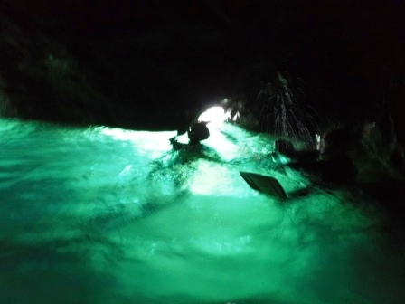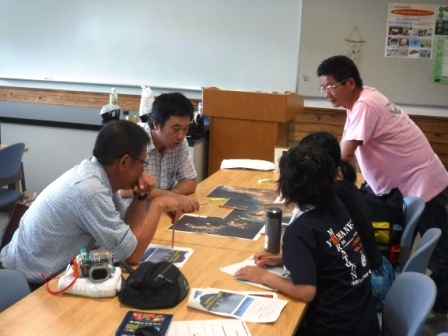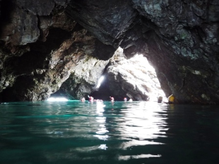 講師の方に常神での観察ポイントや注意点を中心に講義を行っていただき、船で常神へ移動しました。2グループに分かれてリーダー・サブリーダーの役割分担を決め、実際にスノーケリングを行うコースや観察ポイントの確認を行いました。特に常神は洞窟があることから、監視体制や注意点について検討しました。海浜自然センターへ戻ってからは観察できた生きものを付箋に書き、地図に貼って観察ポイントや種類について情報共有を行いました。