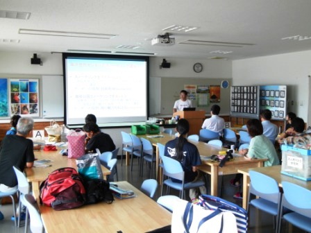 午前中は講師の方にリーダーの危機管理や海域公園スノーケリングでのリーダーに必要な知識、烏辺島での観察について講義を行っていただきました。午後は船で烏辺島へ移動し、2グループに分かれてリーダー・サブリーダーの役割分担を決め、実際にスノーケリングを行うコースの確認を行いました。海浜自然センターへ戻ってきたら観察できた生きものを付箋に書き、地図に貼って観察ポイントや種類について情報共有を行いました。
