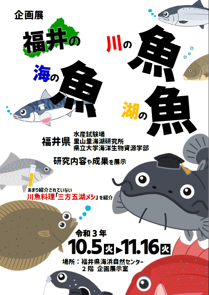 福井県水産試験場・福井県立大学海洋生物資源学部・里山里海湖研究所で行われている研究成果の一端を展示します。水産試験場で力を入れているマハタやサバなどの魚の養殖研究、県立大学海洋生物資源学部で2022年度に新設される「先端増養殖科学科」の学科紹介、里山里海湖研究所のコイやフナなど三方五湖の魚と食文化の紹介を展示します。