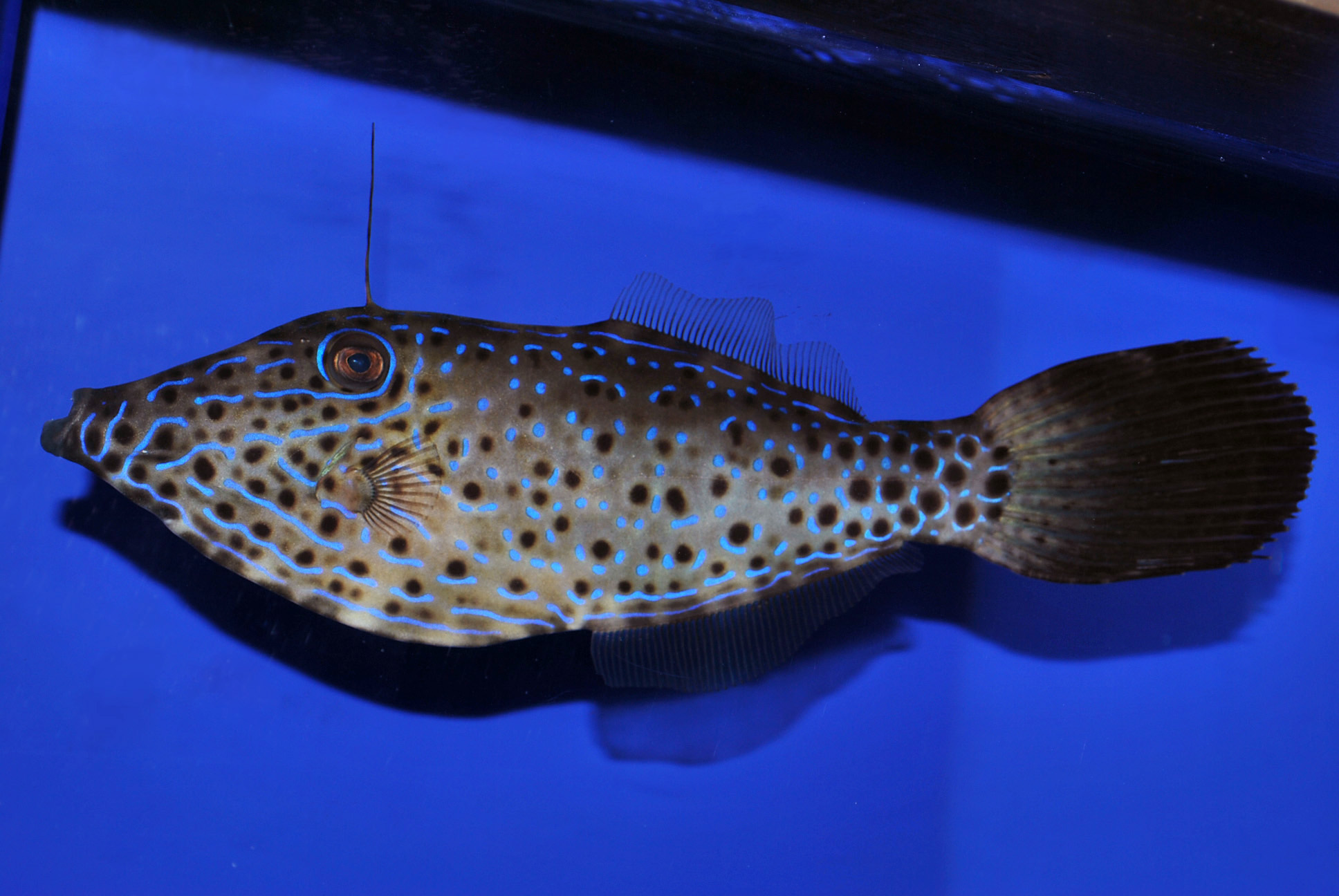 「ソウシハギ」は75cm程になる大型のカワハギの仲間です。尾びれが大きく、灰褐色の体に不規則な青色の線模様があることが特徴です。餌のスナイソギンチャク類由来の致死性の猛毒「パリトキシン」を肝臓などの内臓や消化管に含んでいることがあります。パリトキシンはフグ毒「テトロドトキシン」の数十倍の毒性を持つと言われる自然界屈指の猛毒です。